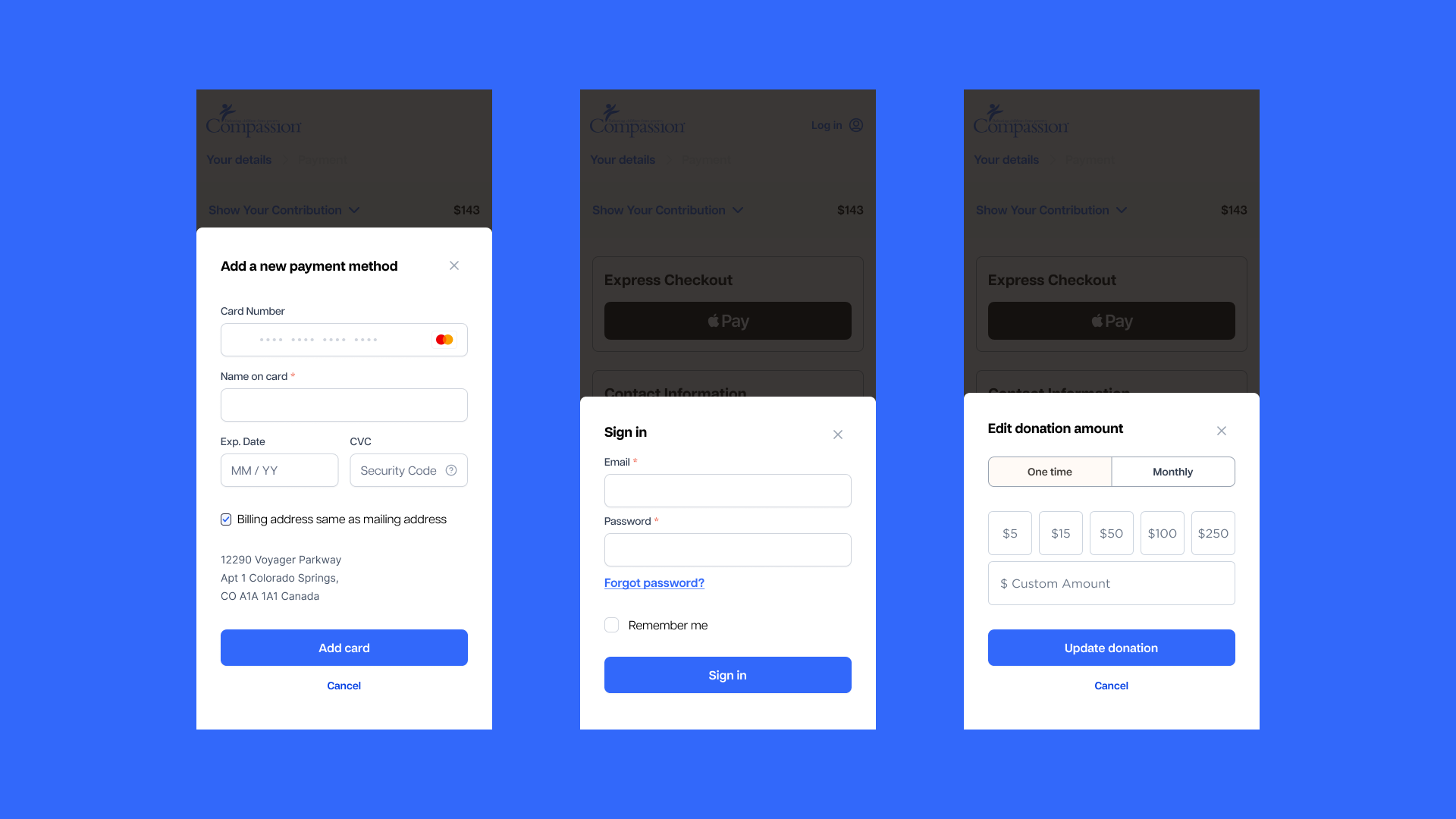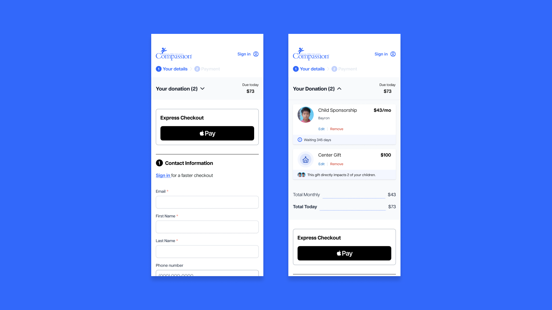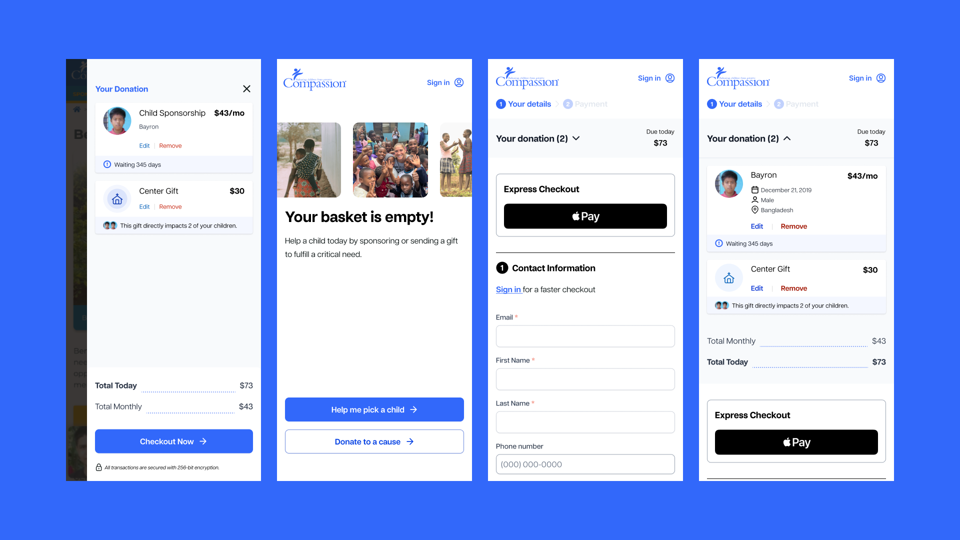 Compassion is in the process of refactoring their website, beginning with checkout. Along with some new brand elements, we’re taking this opportunity to improve the overall UX of checkout.