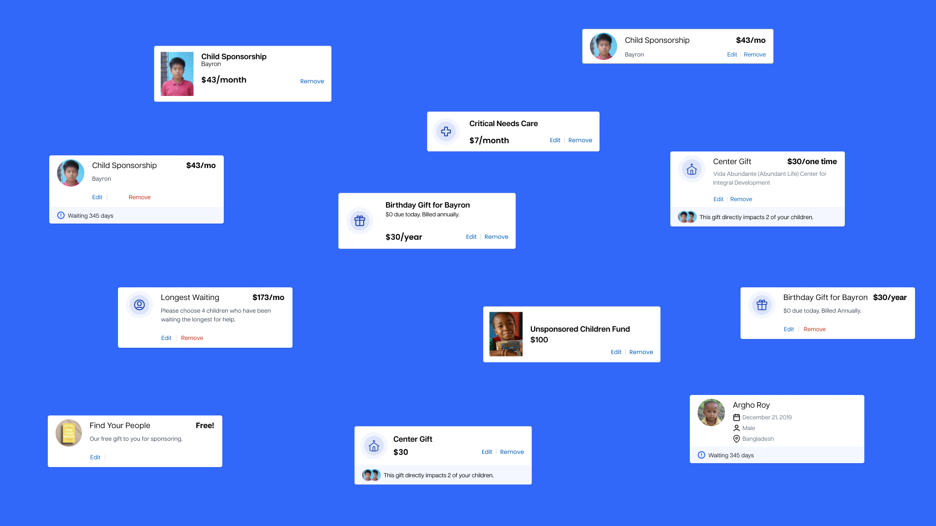 The challenge lay in crafting a versatile component capable of accommodating various donation types – from child sponsorships and funds to a range of gifts and upsells. Many of these distinctions are internal Compassion terminology, irrelevant to the end user. Therefore, our priority was to ensure clear and intuitive display of donation options, regardless of their backend organization.